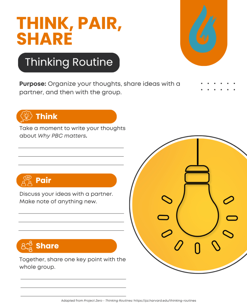 Participants first reflected independently on key questions, then discussed their thinking with a partner, and finally shared insights with the larger group. This structure supported deeper processing of content while making individual perspectives visible within the group.