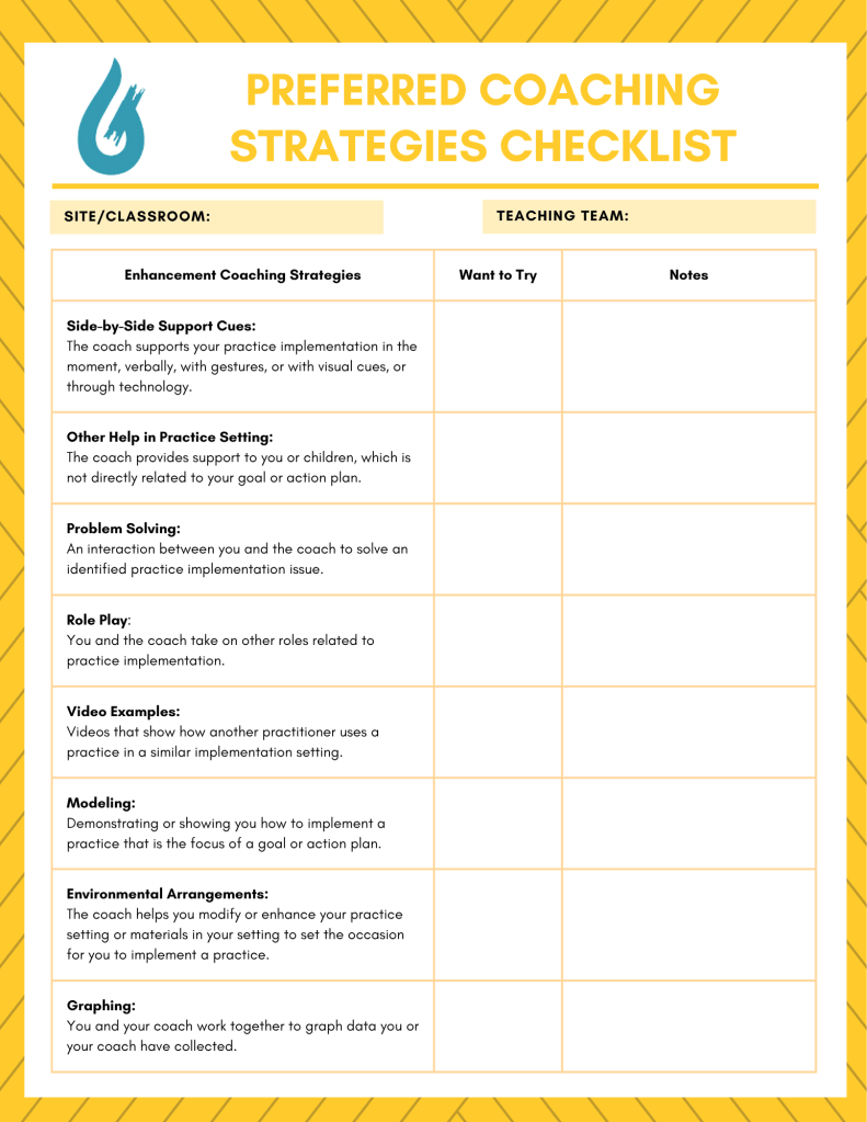 Participants reviewed a range of strategies (i.e., modeling, role play, side-by-side support) and reflected on which approaches would be best to support implementation. By documenting intended strategies and notes, they created a personalized plan for use in upcoming coaching interactions.